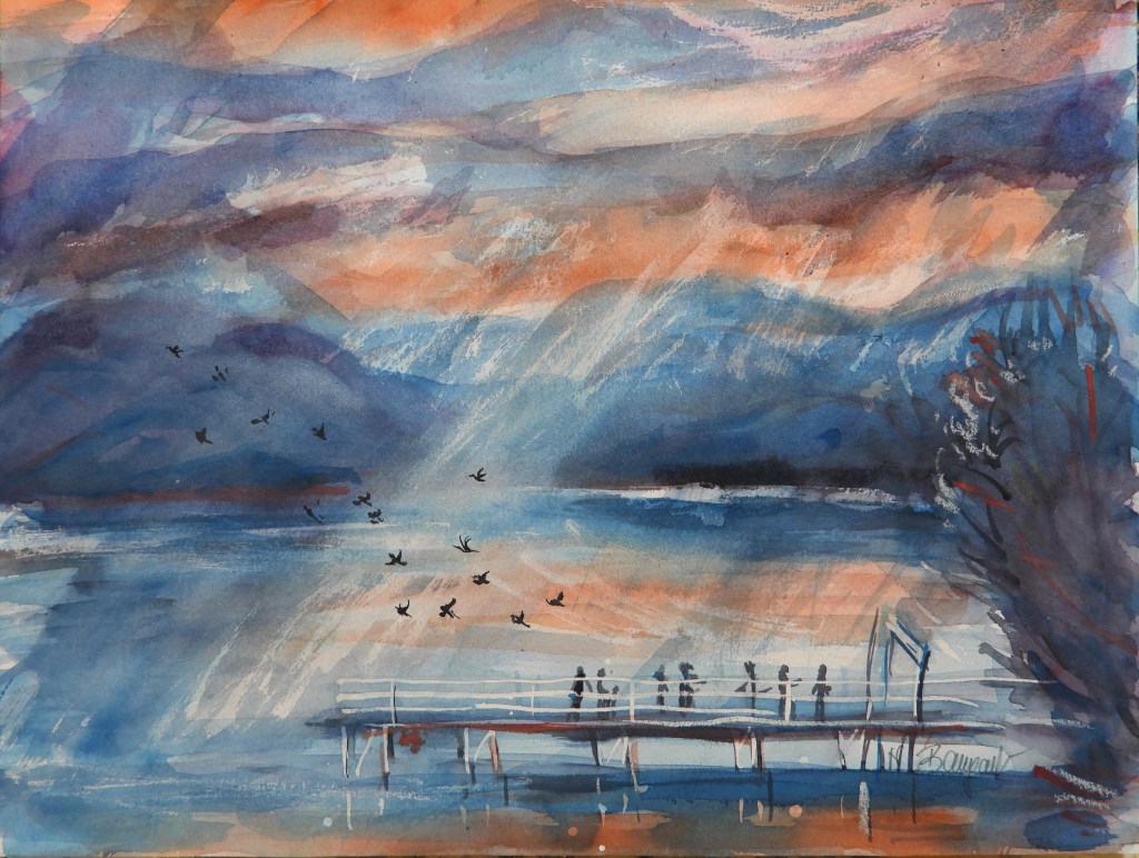 Die Tiere nähern sich ihm freiwillig, aus Neugier und Vertrauen. Den „Kuss des Fuchses“ hab ich versucht, hier in einem Aquarell festzuhalten.