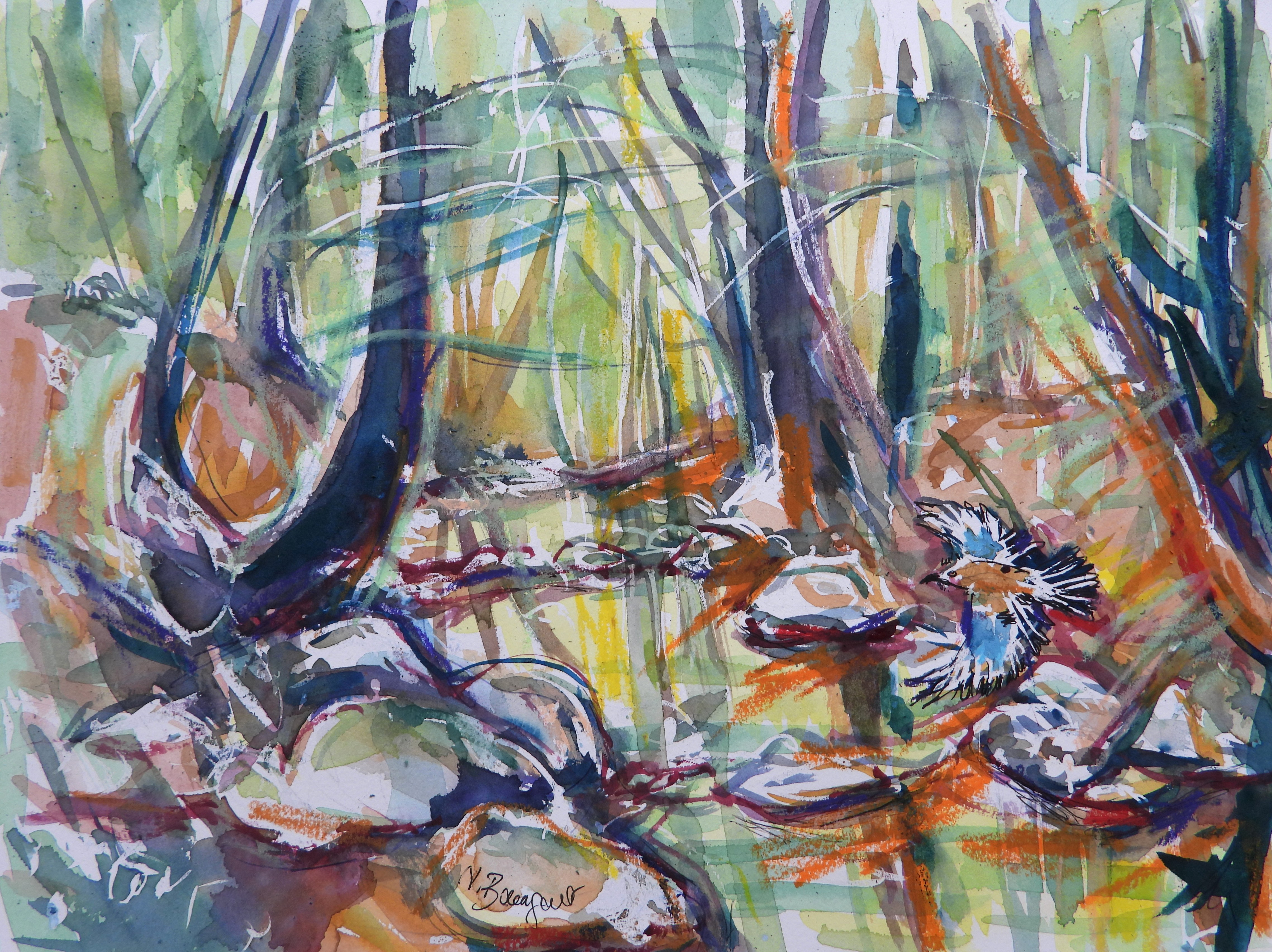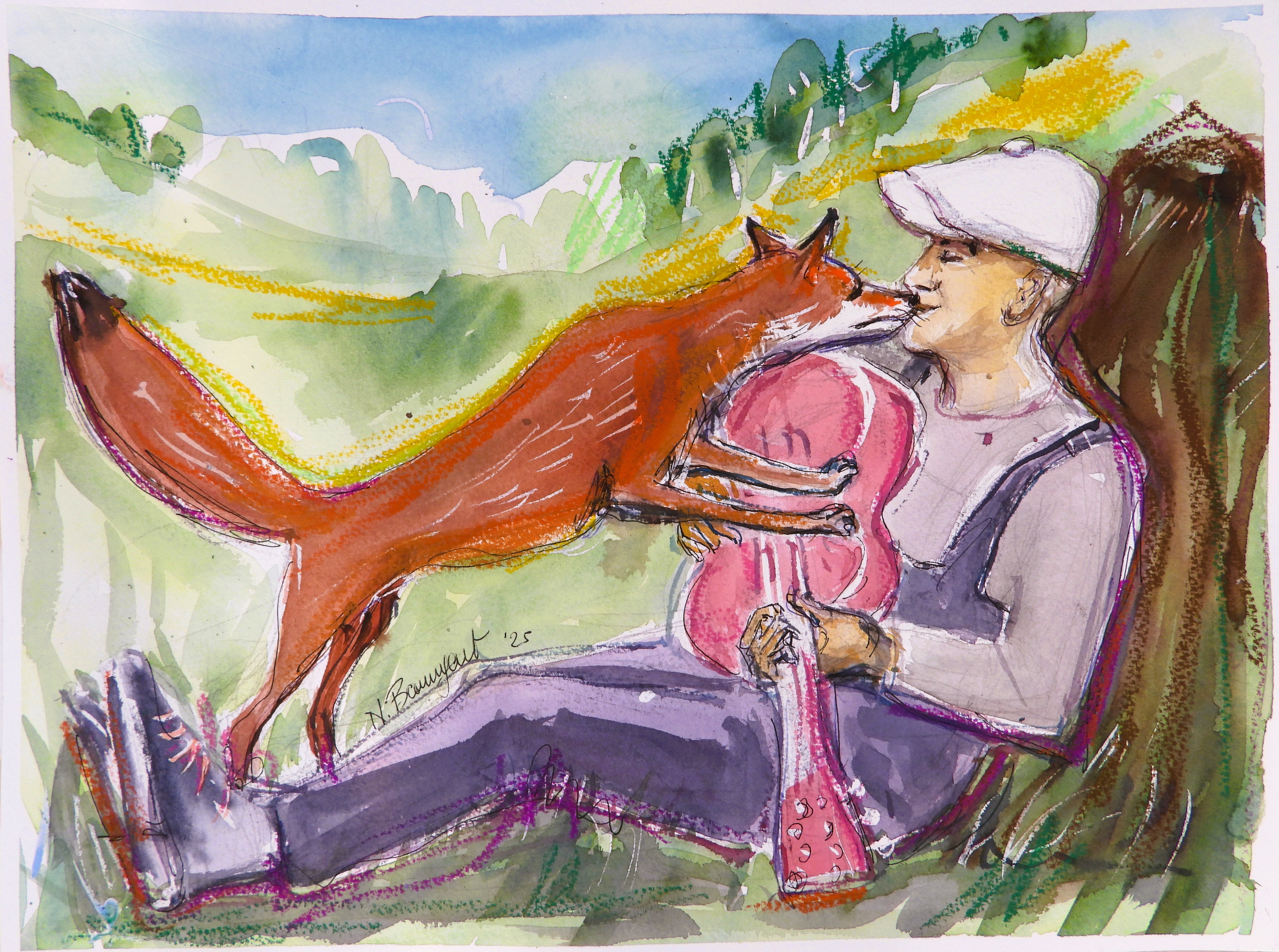 The animals approach him freely, drawn by curiosity and trust. I tried to capture the “fox’s kiss” in a watercolor.