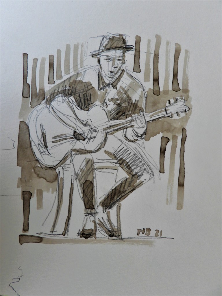 Endlich konnte ich mal wieder schnelle Skizzen von einem Musiker machen, ich war schon vor lauter Absagen außer Übung. Gestern waren wir beim Wirtsbauern in Langeneck, wo ein Musikkabarettist uns einen sehr schönen Abend bescherte.