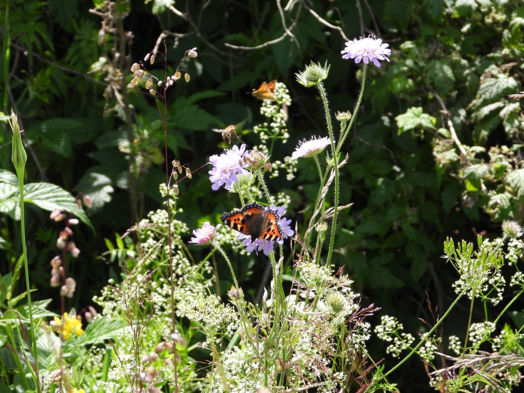 Nebeneinander wiegten sich im selben Rhythmus Glockenblumen, Distel, Wundklee, Wiesen-Pippau und Fingerhut, begleitet vom Nicken der Adlerfarne und des Zittergrases. Immer wieder schüttelt der Wind alle Pflanzen durch. Irgendwo muhen Kühe. Und über all dem schwirren trunkene Falter.
