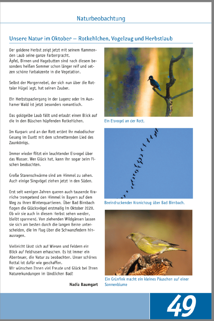 Das goldgelbe Laub fällt und erlaubt einen Blick auf die in den Büschen hüpfenden Rotkehlchen. Im Kurpark und an der Rott ertönt ihr melodischer Gesang im Duett mit dem schmetternden Lied des Zaunkönigs. Immer wieder flitzt ein leuchtender Eisvogel über das Wasser. Wer Glück hat, kann ihn sogar beim Fischen beobachten.