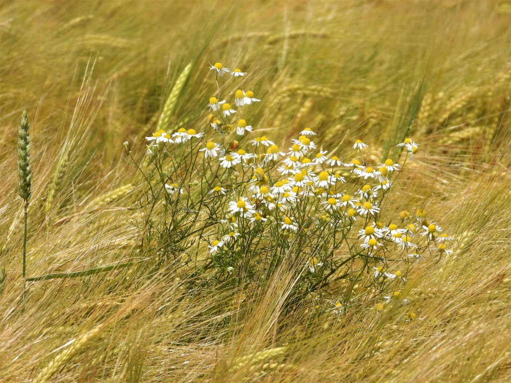Den Landwirt kenne ich nicht, möchte ihm aber „Danke!“ zurufen. Denn dieser blaue Streifen ist nicht nur schön, sondern zieht eine Unmenge von Bienen und Insekten an. Es hat richtig gebrummt zwischen den vielen Blüten. Auf Französisch heißen die Kornblume „bleuet“ und wird als die „Blume der Dichter“ angesehen.
