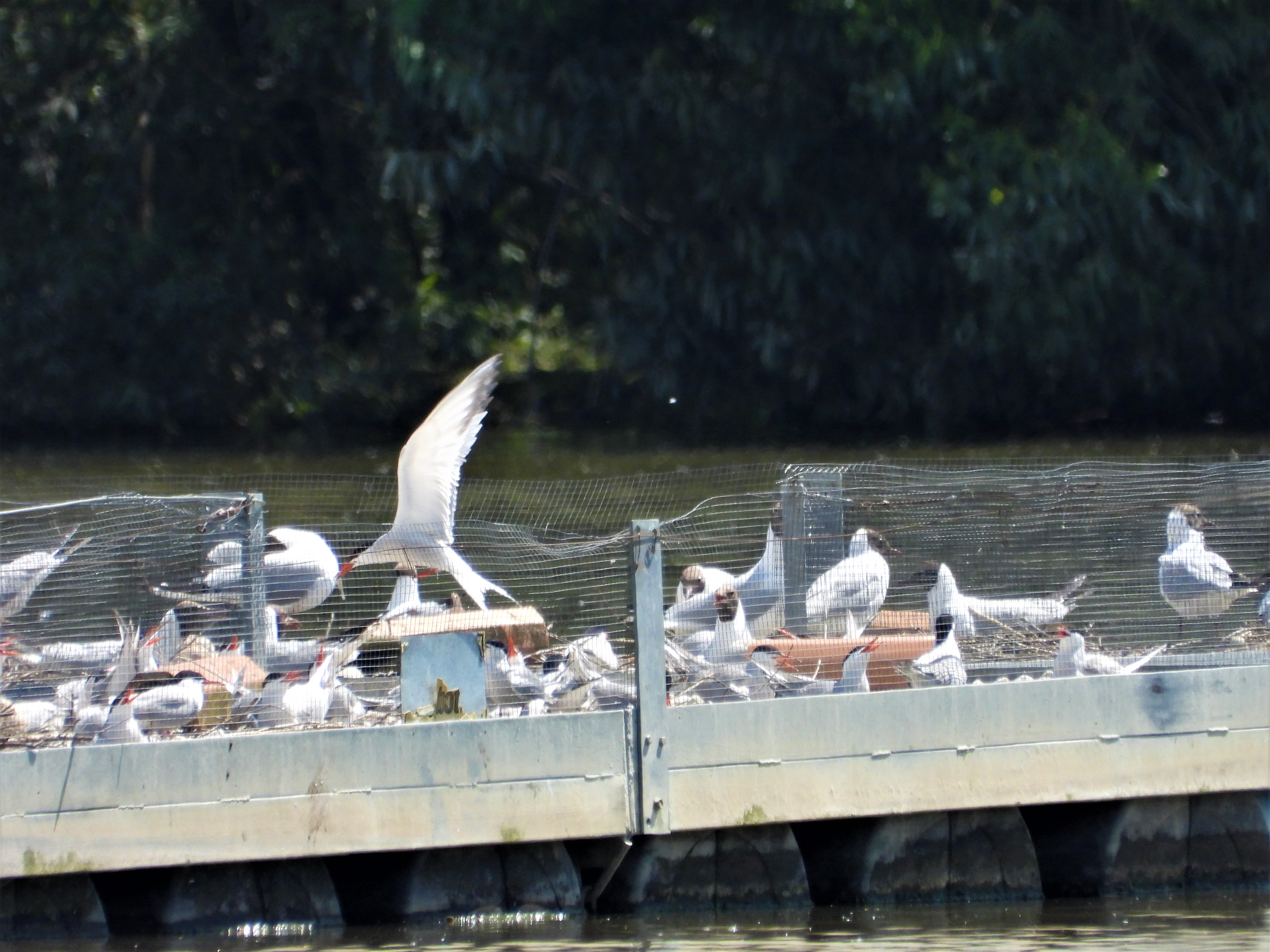 Das Flussseeschwalben- Floß. Es sind auch Lachmöwen dabei.
