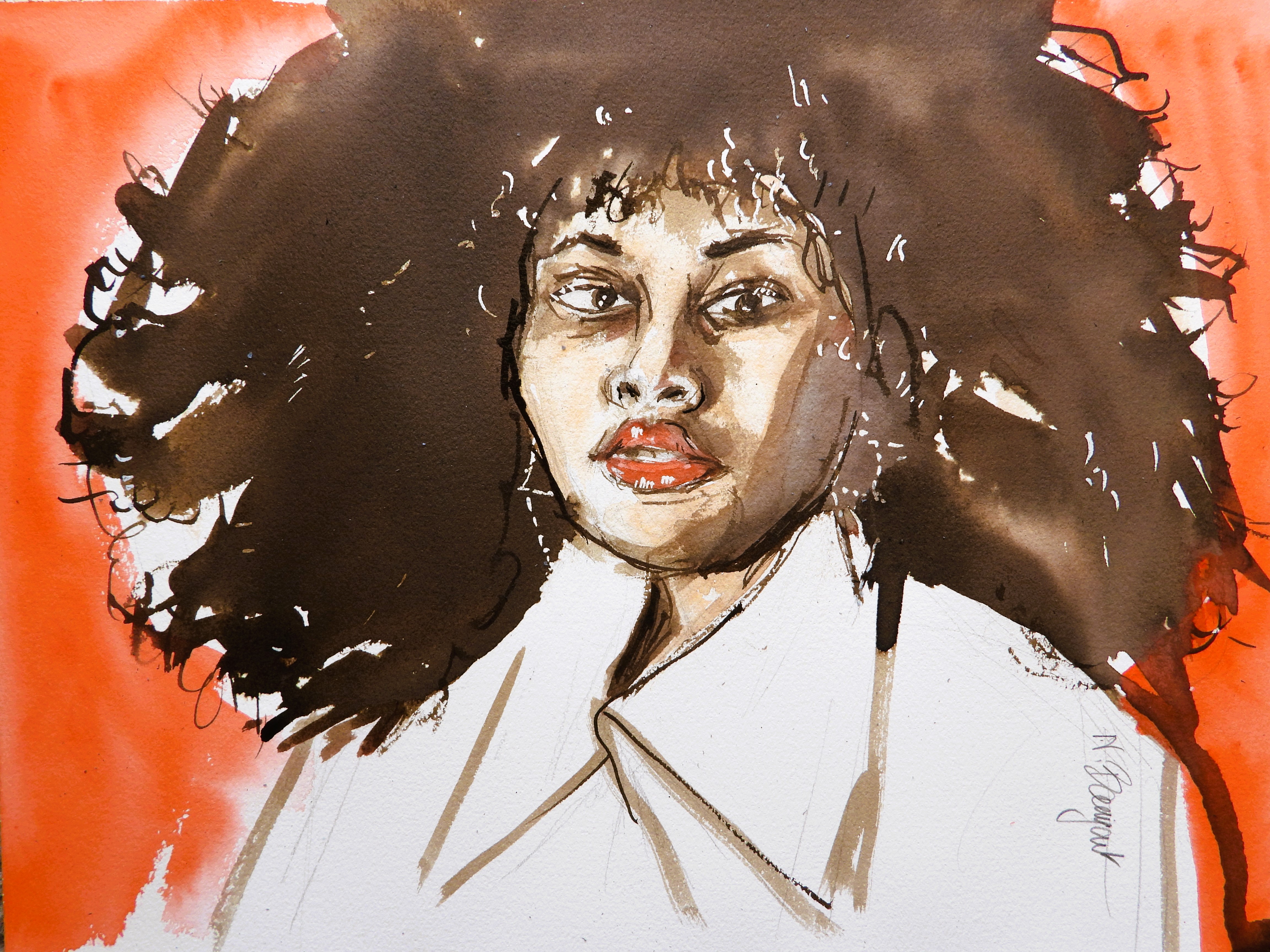 Colette, eine französische Schriftstellerin, die mich seit der Kindheit begleitet. Ich hatte Lust, eine Zeichnung von ihr zu machen, als sie schon älter war. Sie konnte nicht mehr aufstehen und hat im Bett geschrieben. Sie hat auch im Bett ihren Besuch empfangen. Sie ist eine dieser Frauen, die uns heute noch inspirieren können, finde ich….Heute wäre sie 152 Jahre alt.