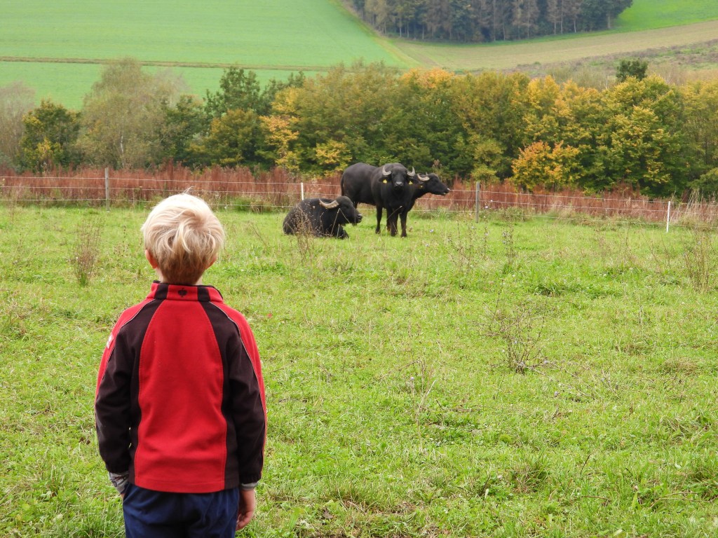 Die Rottaler Wasserbüffel haben 2 Kälber bekommenSohn Jonas passt auf seine Herde auf.
