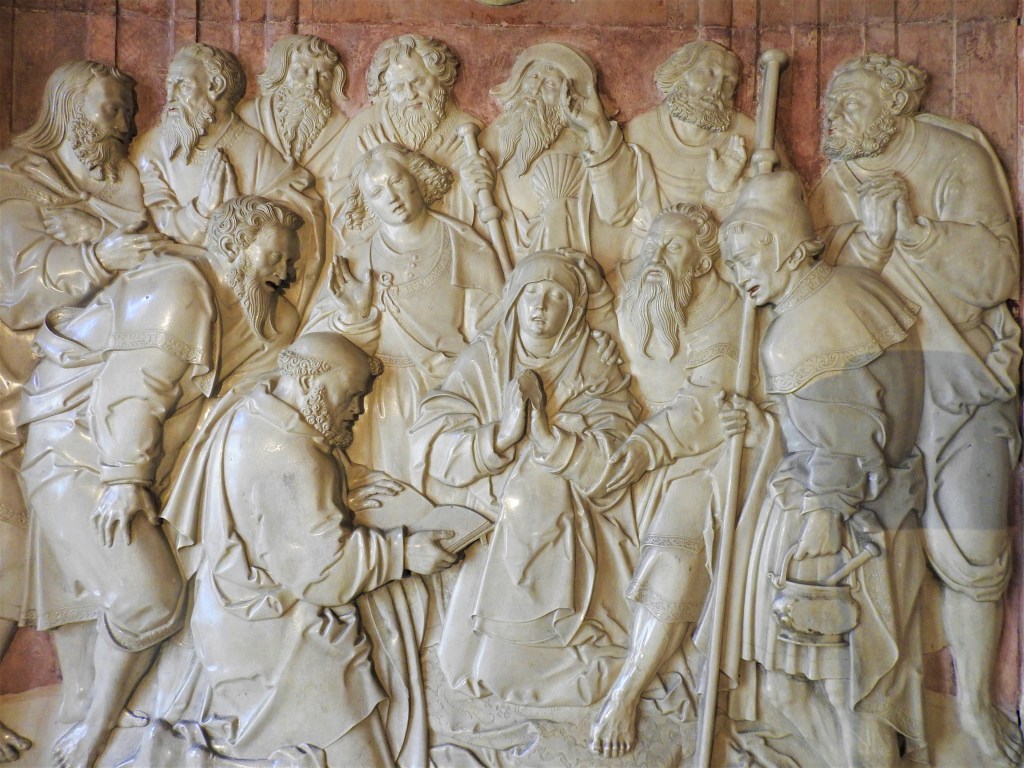 Ein Emaillekästchen von 1395 mit Tiermotiven aus Paris hat mir besonders gefallen. Und der Marienaltar mit der schönen Darstellung der sterbenden Maria (Schaumbergaltar). Solch eine Szene hatte ich bisher noch nicht gesehen; ich fand sie berührend: Hier ist Maria nicht mehr nur die Gebärende, sondern eben auch die Sterbende. Befremdlich fand ich, dass sie im Kreise der Apostel dargestellt wird. Eine einzelne Frau in einer Männerwelt….
