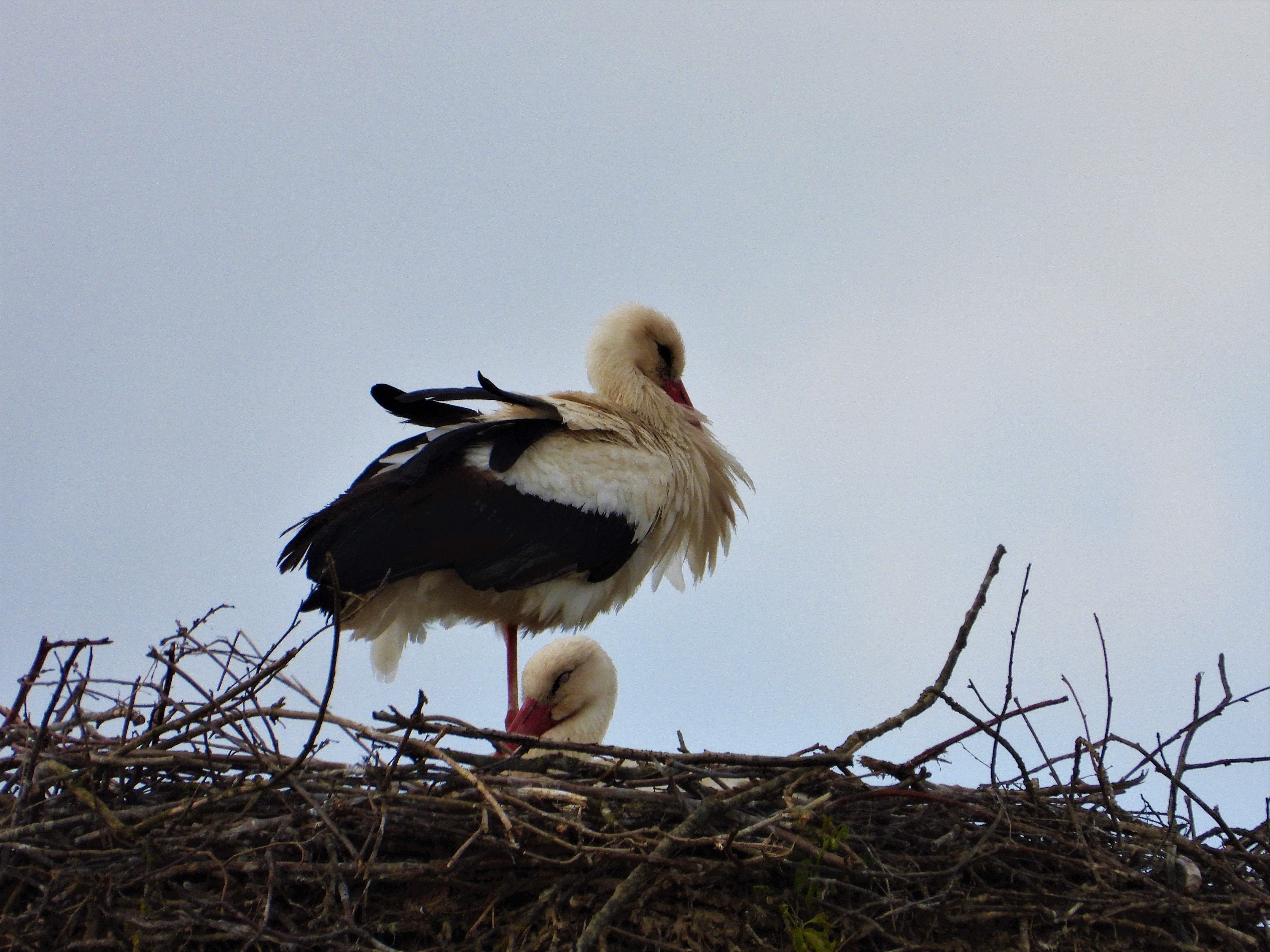 FR: Nos cigognes se promènent le long d´un sentier de randonnée au milieu des cyclistes, chiens et promeneurs.