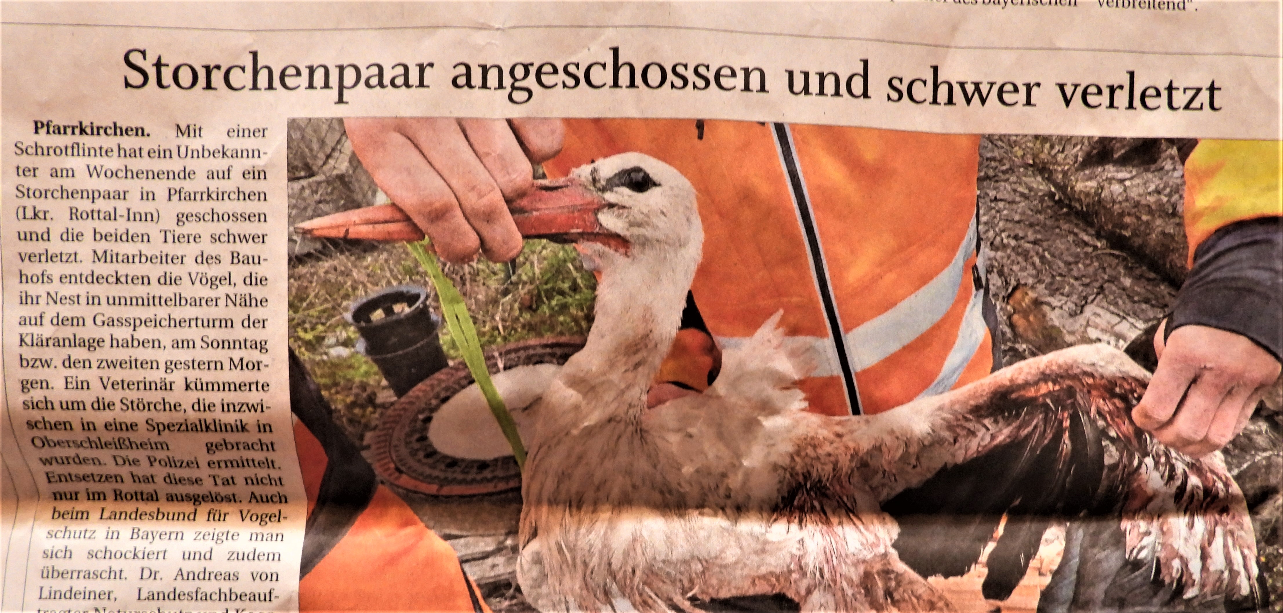 Als ich damals diese Sache erfuhr und die Fotos sah, war ich entsetzt. Der Weißstorch als Kinder- und Glücksbringer und Symbol von Heimat, ein eleganter Vogel, der gerne mitten unter uns lebt und uns vertraut. Wer sollte diesem Tier etwas tun wollen? Und warum? Dass so etwas auch bei uns im Landkreis Rottal-Inn geschehen würde, daran hätte ich nicht mal im Traum gedacht!