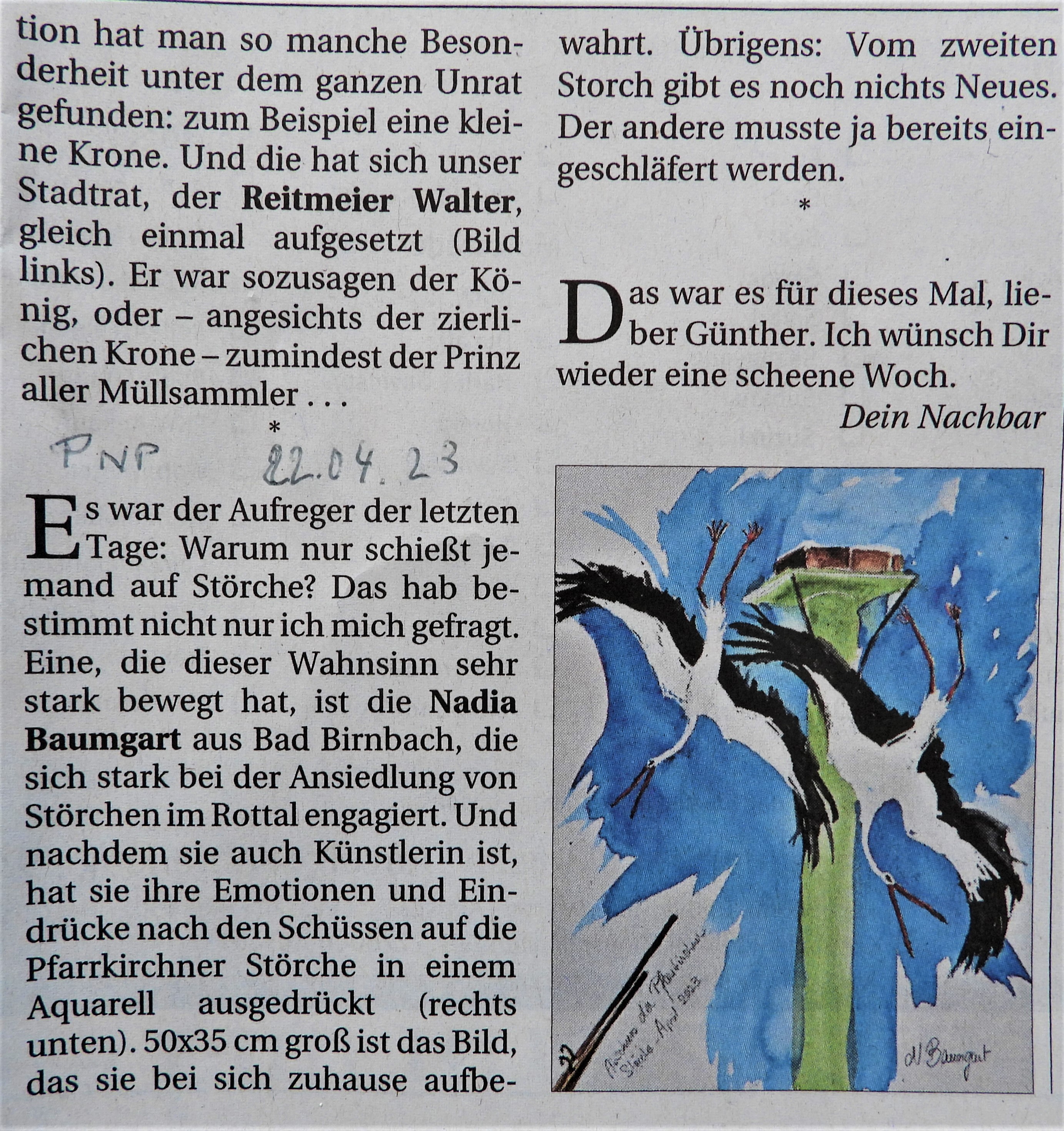 Die Pfarrkirchner Störche 2022Das Storchenbaby 2022Beitrag zu den abgeschossenen Störchen in der PNP -April 2023PNP – 22.04. – Der Nachbar