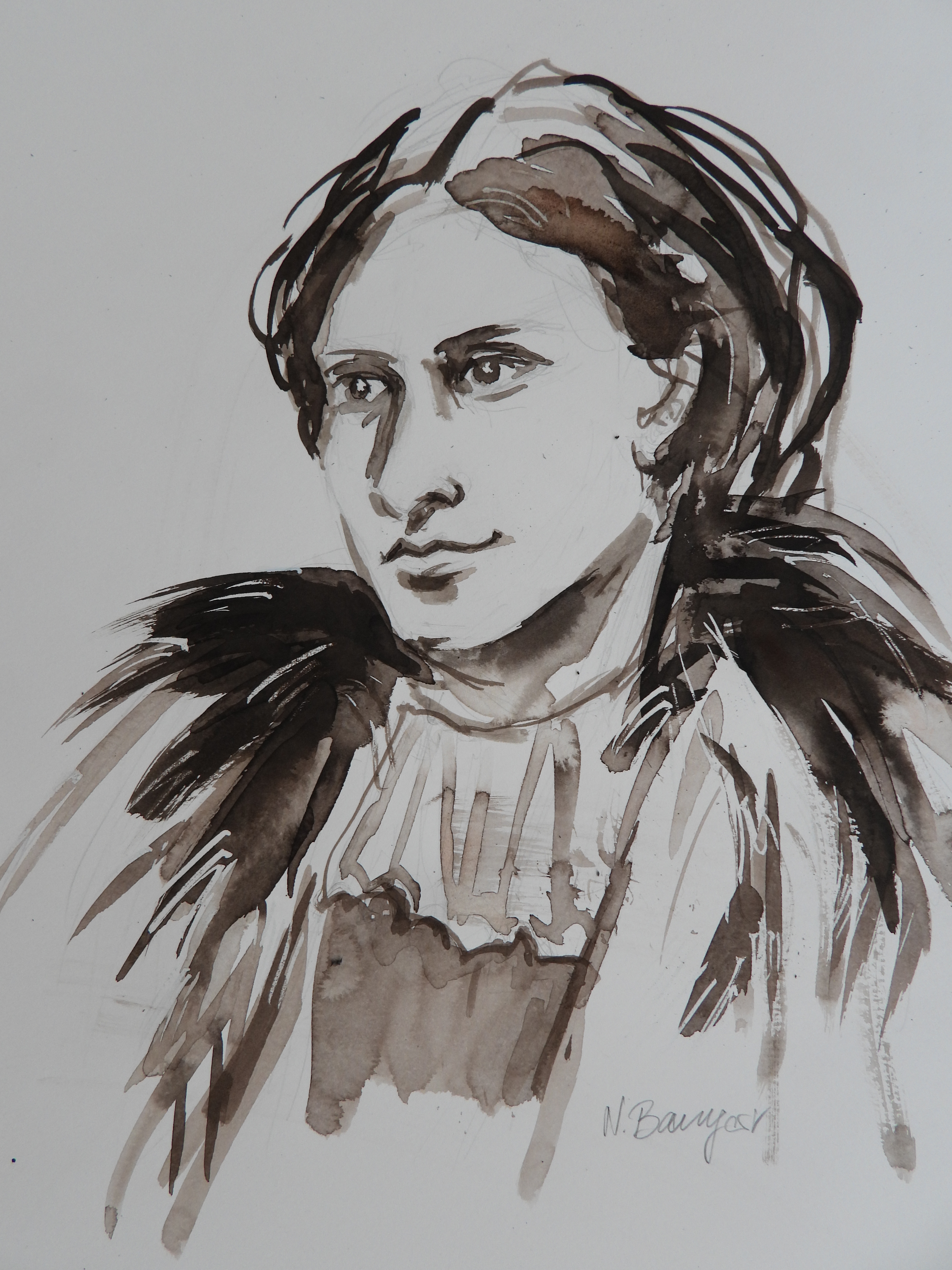 Philosophinnen:Von diesen Fragen spannt sich ein Bogen zur Philosophie: Es entstehen Tuschezeichnungen von Philosophinnen. Das Studium der Philosophie, das ich 2002 an der Universität Siena (Italien) abschloss, bildet die Grundlage dieser Serie. Zuvor hatte ich Kunst in Frankreich studiert.