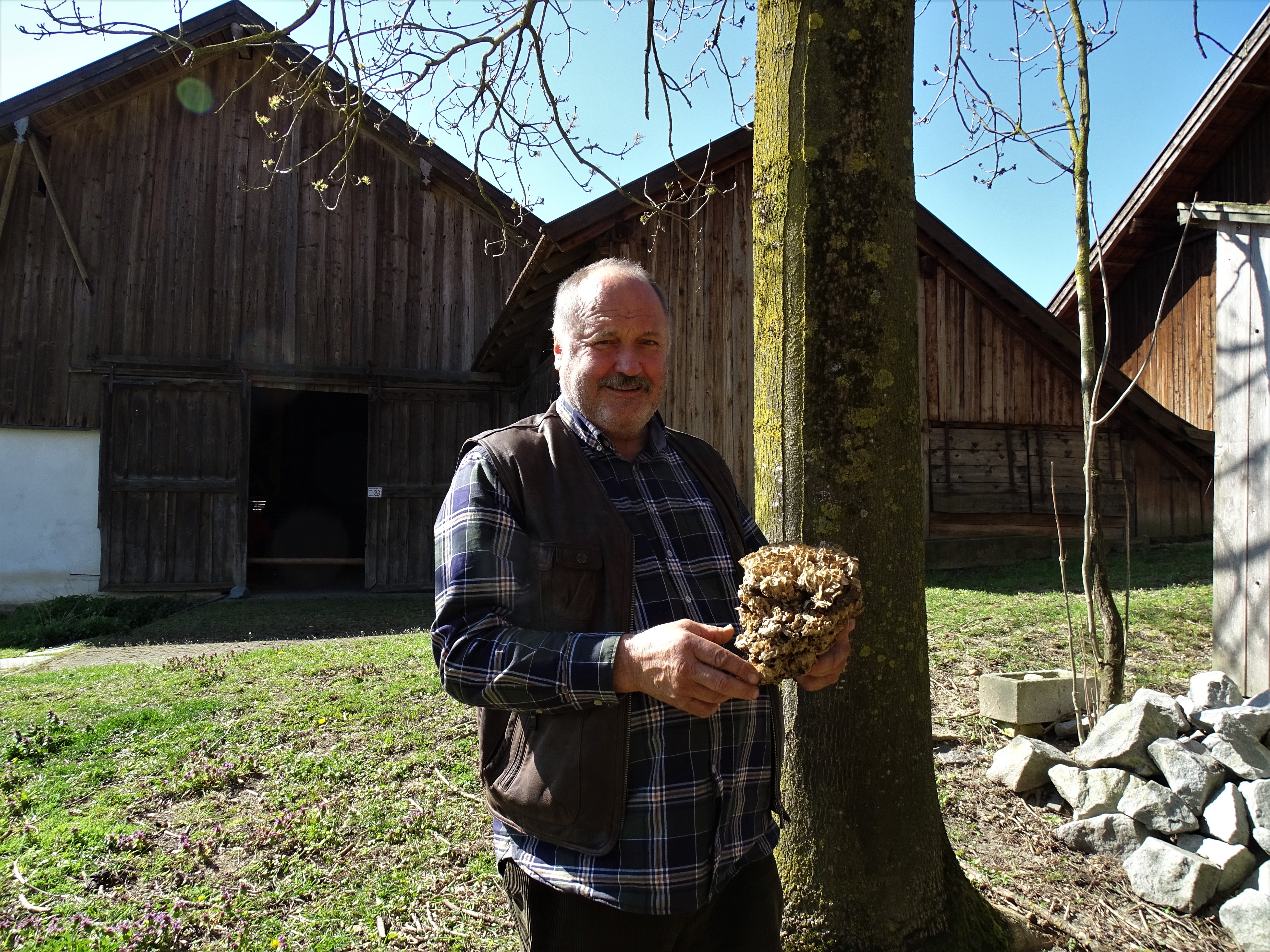 Rührend sind nicht nur seine Hingabe und Liebe zum Handwerk, sondern auch seine Tierliebe: Seit kurzem hält er eine kleine Herde von Kamerunschafen. Für die Turmfalken hat er oben im Stadel einen Nistkasten angebracht, der zu einer erfolgreichen Brut geführt hat. Um ihn summen Bienen: „Mein Vater war leidenschaftlicher Imker“, so Huber. Er halte nur noch ein Volk. Dann zeigt er ein Hornissennest: ausgerechnet im alten Toilettenhäuschen hatten sie ihr Nest gebaut.