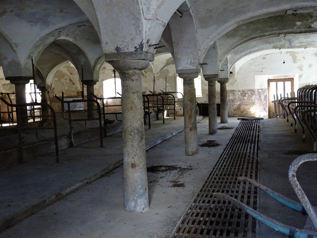 Der ehemalige Rossstall, in dem sich etliche Schwalbennester befinden, mutet mit seinen Granitsäulen und Gewölben so schön und feierlich an wie eine romanische Kirche. Bis vor wenigen Jahren stand darin noch bayerisches Fleckvieh.