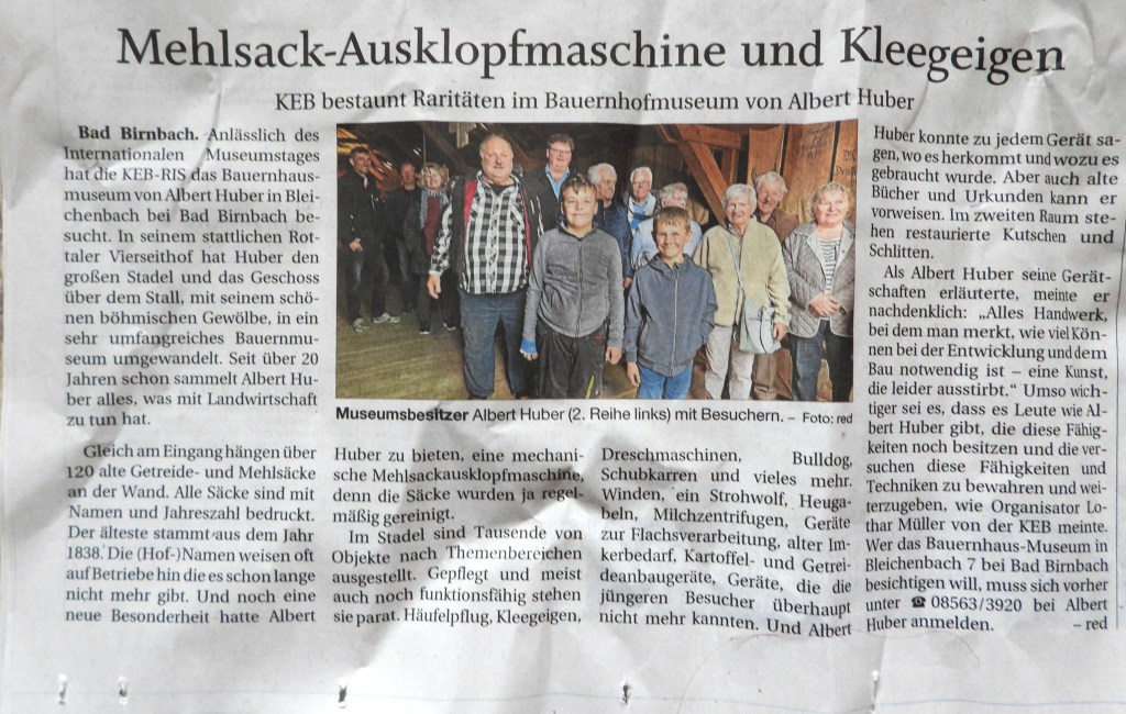 Ein bisschen traurig ist Huber darüber, dass er seinen Hof und seine Schätze bisher der Öffentlichkeit nicht als „privates Museum“ allgemein zugänglich machen konnte. Wird es ihm in Zukunft gelingen? Wir hoffen es! Eine solche Vielfalt alter Bauerngeräte auf einem alten Vierseithof braucht sich vor den Sammlungen in Massing oder Finsterau wahrlich nicht zu verstecken. Touristen und Kurgäste wären sicherlich begeistert, so etwas gewissermaßen „vor der Haustür“ zu finden.