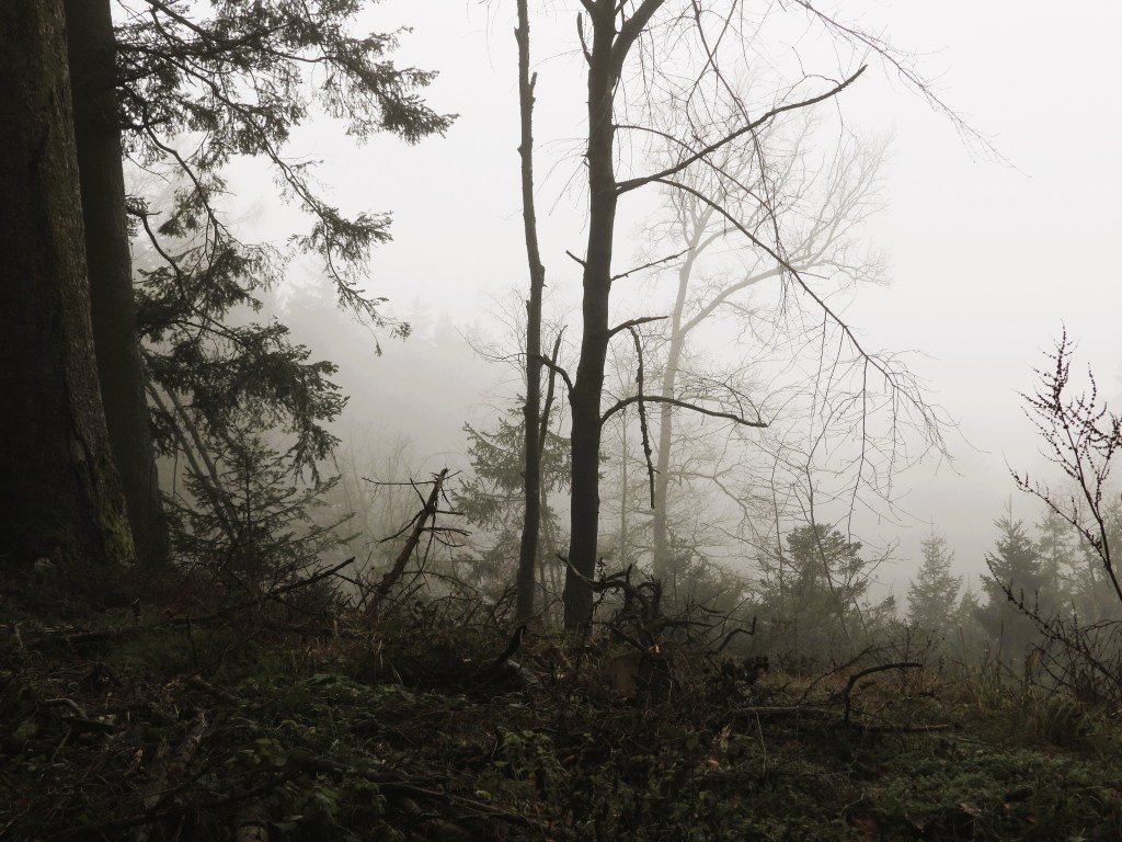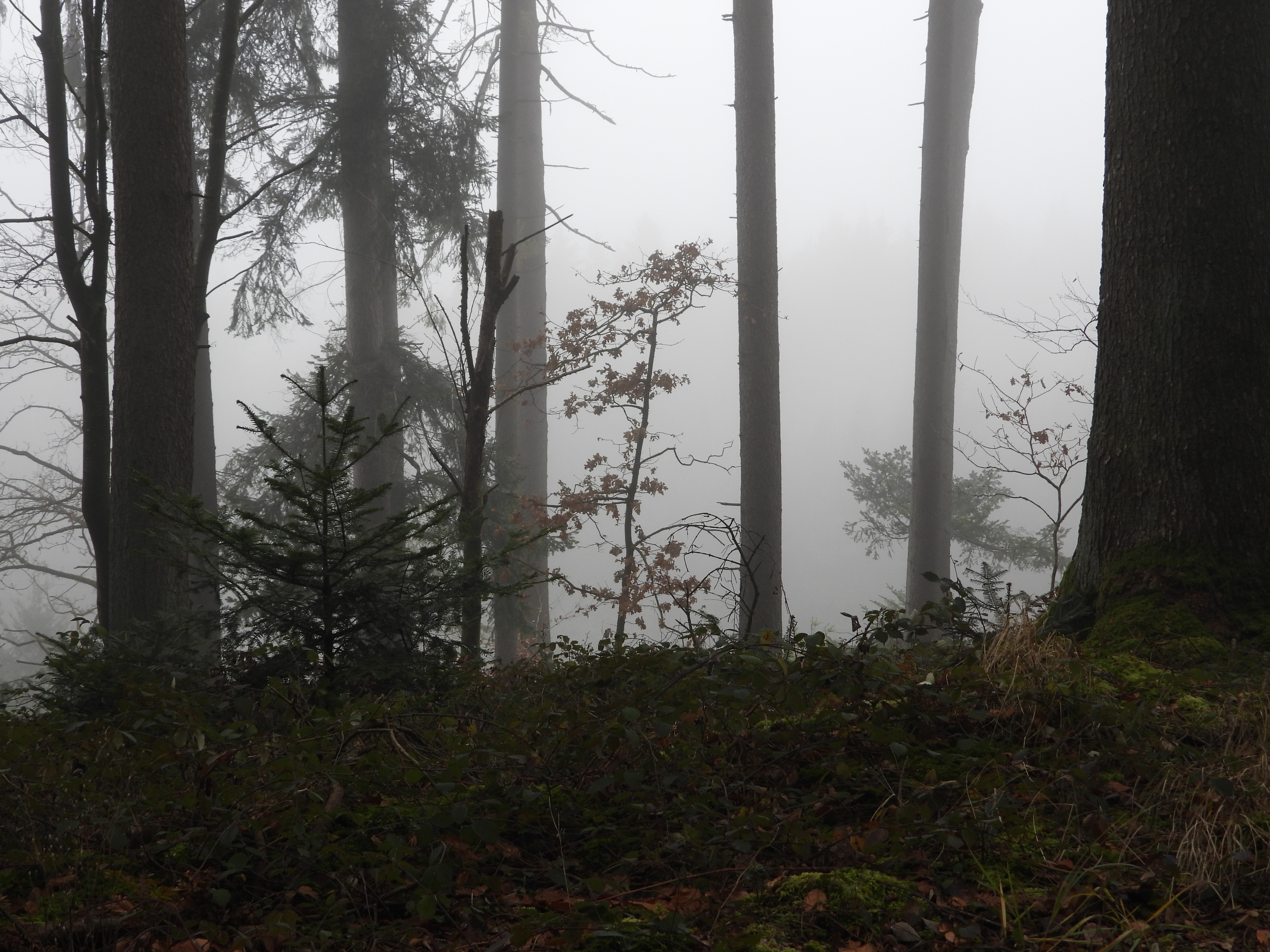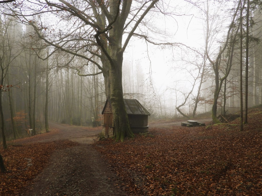 Begleitet vom leisen Gezwitscher der Goldhähnchen und dem Trommeln der Spechte, bin ich heute durch unseren Lugenz-Wald gegangen. Zuerst dachte ich: „Was für eine Nebelsuppe!“, aber dann begann der Zauber: Im hellen Nebeldunst erschien jeder Baum, als hätte er einen eigenen Charakter. Birken, gekleidet in das gesprenkelte Fell eines Schneeleoparden, stehen einzeln am Wegesrand, während die grauen Umrisse von Kiefern und hohen Fichten sich zum Himmel strecken. Die Wege sind gepolstert von rostrotem Buchen- und Eichenlaub. In der Holzkapelle wacht die ewige Mutter.
