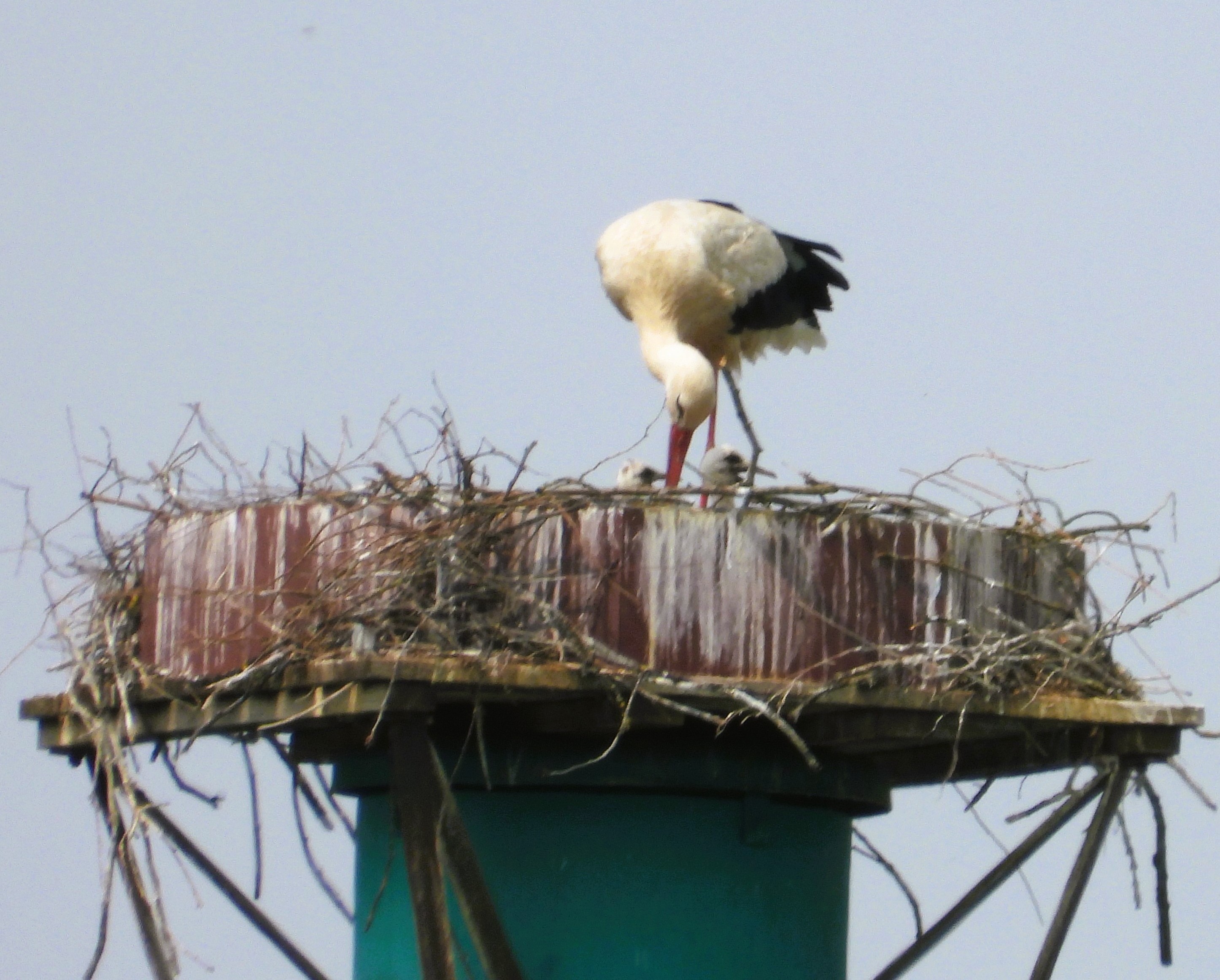 Wie schön! Das Pfarrkirchner Storchenpaar hat Nachwuchs! Mindestens zwei Küken recken neugierig ihre Köpfchen in die Höhe und können sogar schon klappern! Die Nisthilfe auf dem Gasspeicher 2020 ist auf Initiative von Bürgermeister Wolfgang Beißmann vom Bauhof Pfarrkirchen gebaut worden, als damals viele Weißstörche in der Nähe landeten. Hier mehr dazu: Nisthilfen für Weißstörche im Rottal
