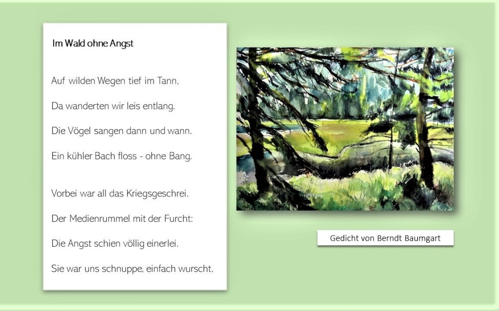 Das Gebrüll der Medien und deren Panikmache gerieten langsam in den Hintergrund. Nachts stieg der Vollmond hoch und ein kühler Regen fiel auf das duftende Gras. Berndt schrieb ein Gedicht dazu: